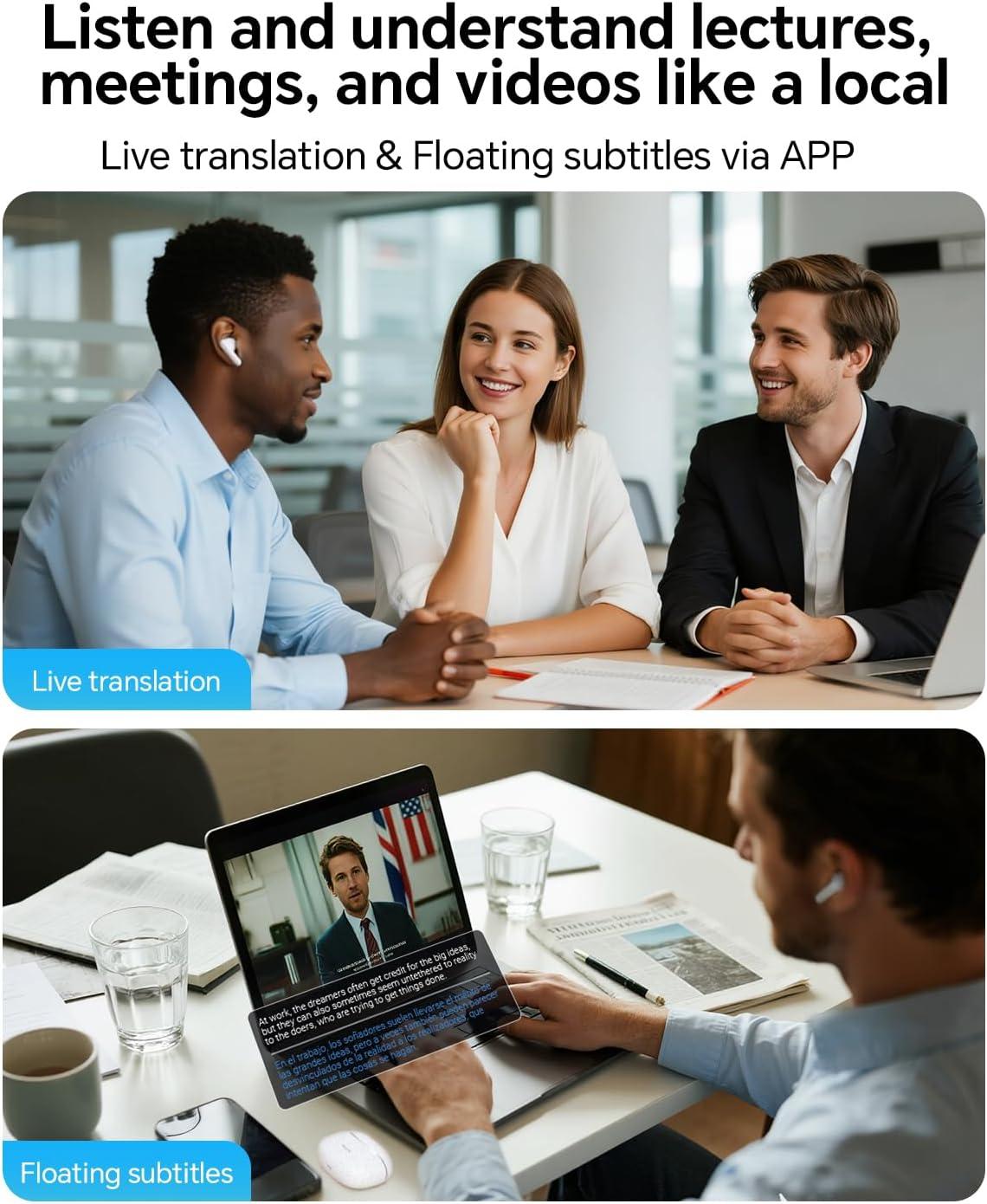 Dual Translation Modes via Polypal App:Connect your P1 earbuds with the Polypal app to unlock two powerful translation features. Live Listening Mode offers real-time in-ear interpretation, perfect for lectures and conversations. Subtitle Mode shows on-screen captions for videos or spoken content—ideal for learning, watching, or quiet environments.
